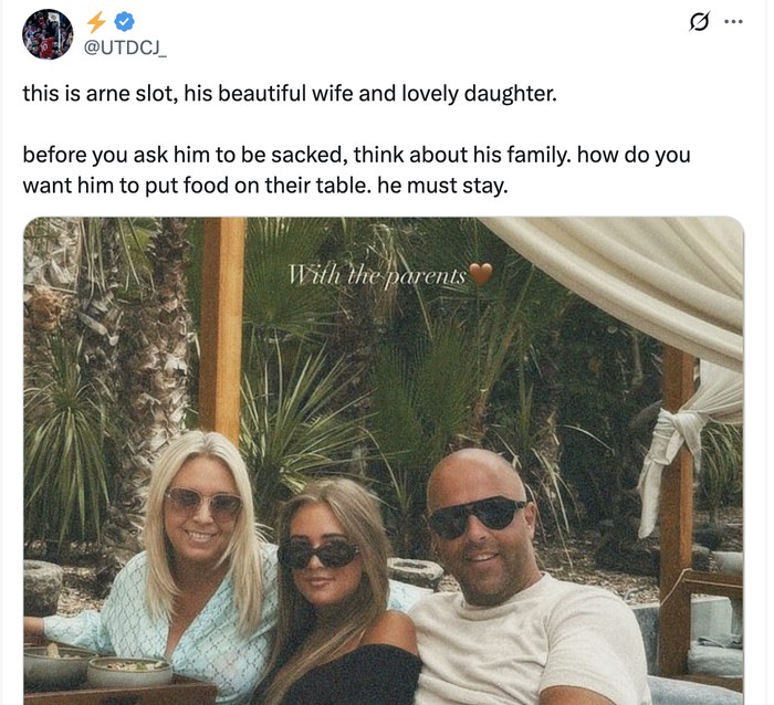 Meme candaan bahwa sebelum memecat Arne Slot, kasihan keluarganya. Foto: X.com
