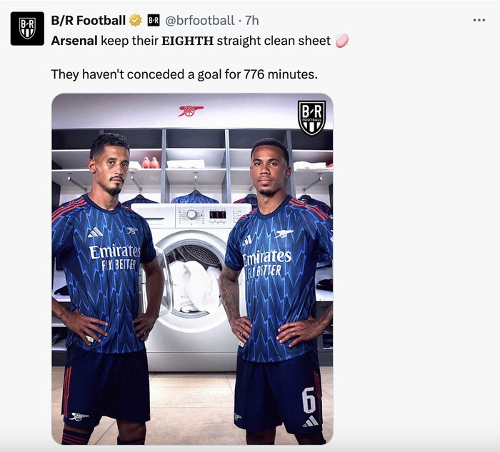 Arsenal tidak kebobolan selama 776 menit. Foto: X.com