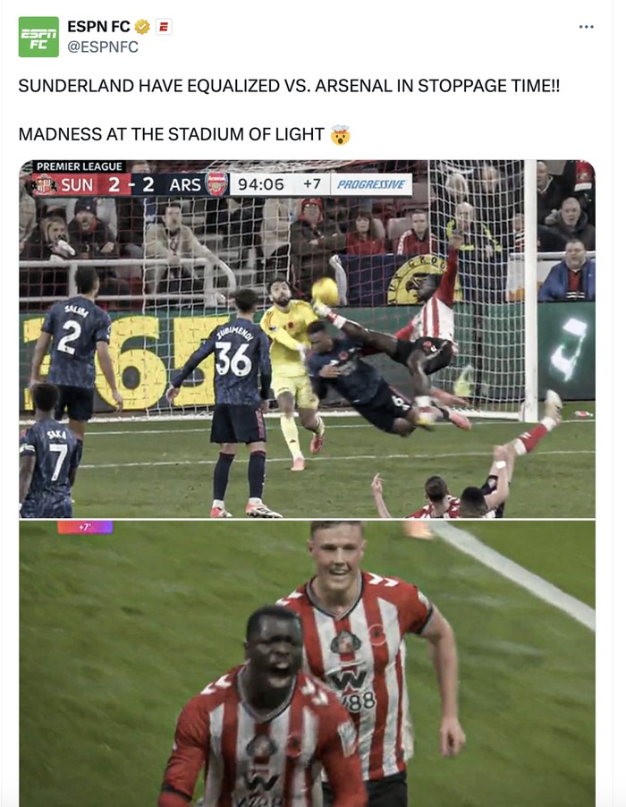 Laga yang sangat dramatis di mana Sunderland menyamakan kedudukan di menit tambahan. Foto: X.com