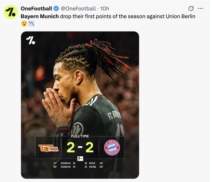 Setelah melibas banyak tim besar, Bayern Munich akhirnya ditahan imbang Union Berlin. Foto: X.com