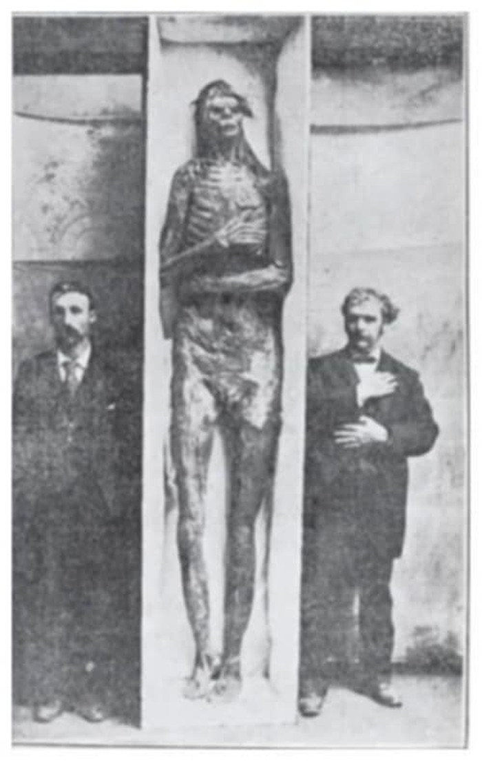 Keaslian gambar ini belum dapat dipastikan, tetapi para ahli sepakat bahwa raksasa dalam foto tersebut tampak sangat nyata. Kerangka raksasa ini ditemukan pada tahun 1912 di Danau Delavan, Wisconsin. Namun, penemuan arkeologi yang mencengangkan ini hanyalah satu dari lusinan penemuan serupa yang dilaporkan di sekitar area tersebut sejak tahun 1851. Pada tanggal 20 Desember 1897, misalnya, Times menulis laporan tentang tiga gundukan pemakaman besar yang telah ditemukan di Maple Creek, Wisconsin. Laporan tersebut menyatakan: β DI DALAMNYA DITEMUKAN KERANGKA SEORANG PRIA BERUKURAN SANGAT BESAR. TULANG-TULANGNYA BERUKURAN LEBIH DARI SEMBILAN KAKI DARI KEPALA HINGGA KAKI DAN DALAM KONDISI TERAWAT YANG CUKUP BAIK. TENGKORAKNYA SEBESAR UKURAN SETENGAH BUSHEL. BEBERAPA BATANG TEMBAGA YANG DIPERLAKUKAN DENGAN HALUS DAN RELIK-RELIK LAINNYA TERLETAK DI DEKAT TULANG-TULANG ITU .β Foto: Boredpanda