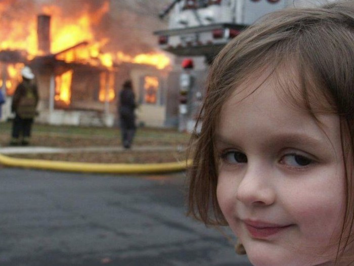 Meme legendaris lainnya adalah Disaster Girl yang merupakan wajah Zoe Roth. Meme ini dipakai untuk situasi pembuat masalah. Padahal, aslinya Zoe RothΒ sedang menonton latihan pemadam kebakaran. Foto: X.com