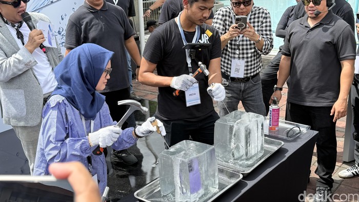 Realme C85 dibenamkan di dalam bongkahan es. Baterai ponsel ini dapat bertahan di suhu -20 derajat Celsius sampai 40 derajat Celsius. Foto: Virgina Maulita Putri/detikINET