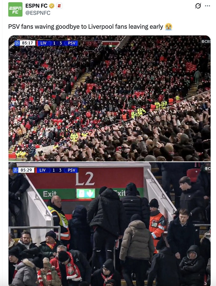 Fans PSV melambaikan tangan selamat tinggal pada fans Liverpool yang meninggalkan laga lebih awal. Foto: X.com