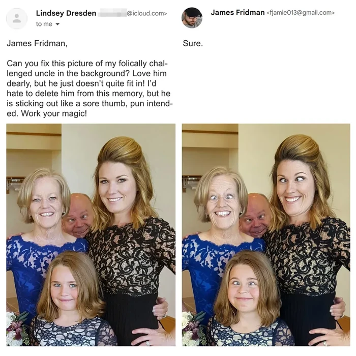 Permintaan menghapus paman berkepala plontos di belakang malah dibalas James Fridman dengan membuat semua orang dalam foto bermata juling. Hasilnya makin kocak. Foto: Instagram/@fjamie013