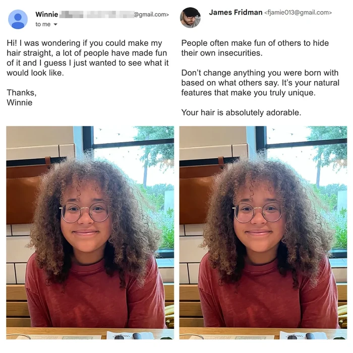 Seorang gadis meminta rambutnya dibuat lurus karena sering diejek. James Fridman justru memberi pesan menyentuh agar ia bangga dengan rambut alaminya. Foto: Instagram/@fjamie013