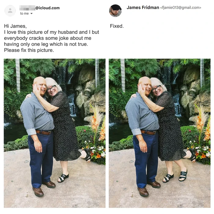 Diminta membetulkan foto karena terlihat seperti hanya memiliki satu kaki, James Fridman malah benar-benar menampilkan tiga kaki. Foto: Instagram/@fjamie013