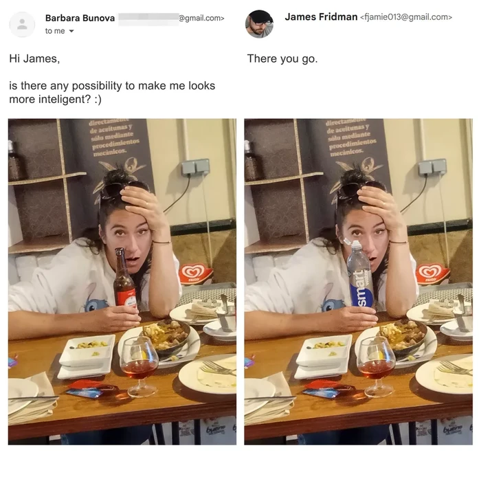 Seorang perempuan ingin terlihat lebih cerdas. Fridman menjawab dengan mengganti botol bir di tangannya menjadi botol air bertuliskan Smart Water β. Foto: Instagram/@fjamie013