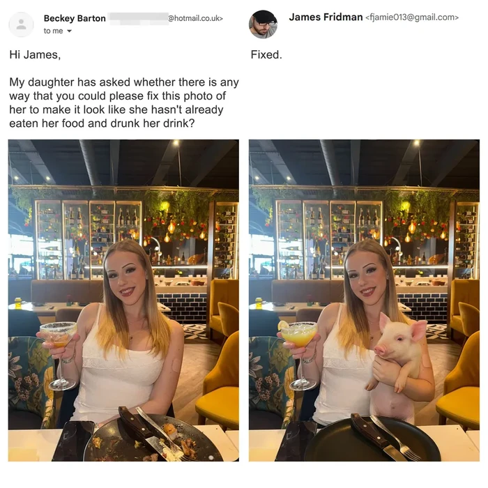 Permintaan agar terlihat belum menyantap makanan dibalas dengan editan absurd: sang gadis digantikan memegang anak babi. Foto: Instagram/@fjamie013