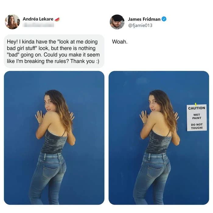 Pengguna meminta pose yang terkesan βnakalβ. James Fridman menambah papan peringatan cat basah, membuat foto terlihat seakan melanggar aturan. Foto: Instagram/@fjamie013