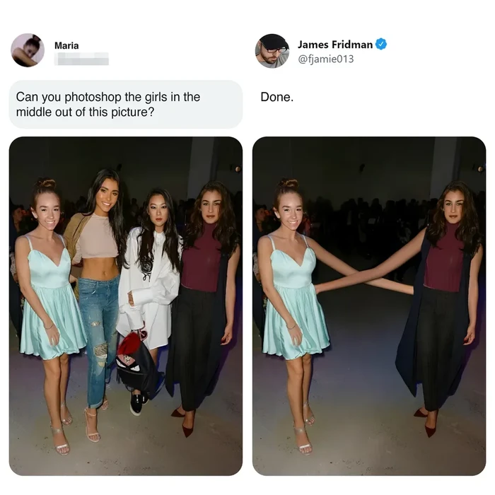 Permintaan menghapus dua teman di tengah dibalas dengan cara tak terduga: kedua teman itu tetap βhadirβ lewat lengan super panjang. Foto: Instagram/@fjamie013