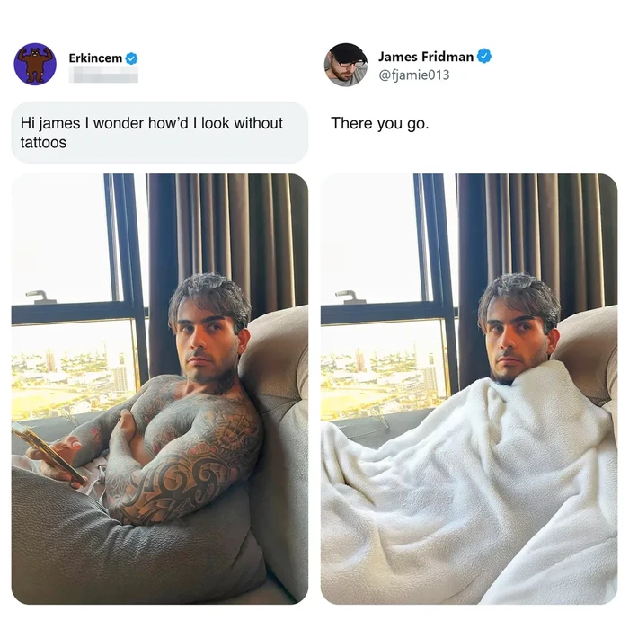 Seorang pria penasaran seperti apa dirinya tanpa tato. James Fridman menjawab dengan⦠membungkus seluruh tubuhnya menggunakan selimut tebal. Foto: Instagram/@fjamie013