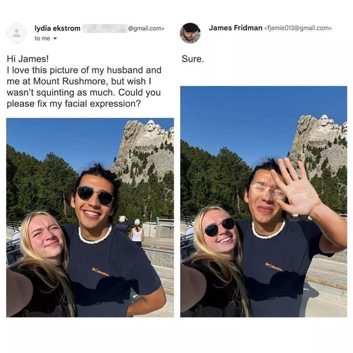 Permintaan seorang perempuan agar ekspresi wajah suaminya dibuat lebih baik saat berfoto di Mount Rushmore dibalas James Fridman dengan editan kocak: sang suami justru terlihat menutupi wajah dari sinar matahari. Foto: Instagram/@fjamie013