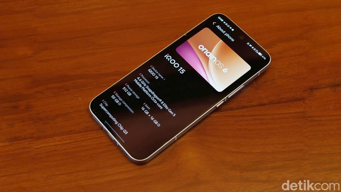 Dapur pacu iQOO 15 ditenagai Snapdragon 8 Elite Gen 5, chipset 3nm terbaru dengan CPU Qualcomm Oryon generasi ketiga. Chipset ini dipasangkan dengan UFS 4.1 dan LPDDR5X Ultra Pro yang mampu mencapai kecepatan baca-tulis hingga 10,7Gbps, memastikan aplikasi berat, game AAA mobile, dan proses multitasking berjalan mulus tanpa jeda. Foto: Adi Fida Rahman/detikINET