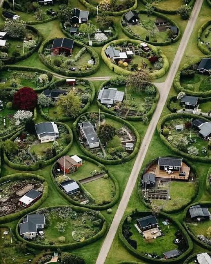 Permukiman unik ini ada di BrΓΈndby Haveby, Denmark, dengan desain halaman berbentuk lingkaran yang terlihat seperti pola labirin dari udara. Foto: Boredpanda