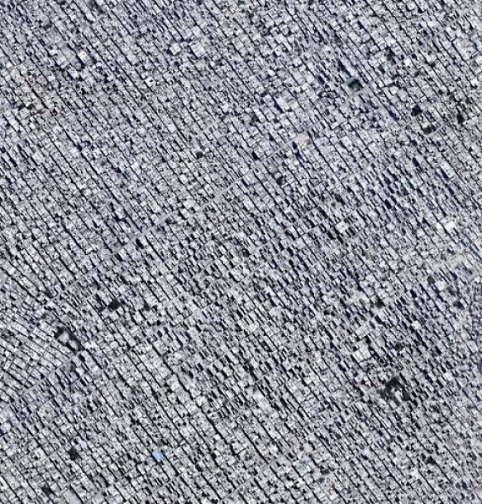 Foto ini memperlihatkan permukiman padat yang terlihat seperti tekstur abstrak dari atas. Diduga kota besar di Asia atau Timur Tengah dengan pola rumah sangat rapat. Foto: Boredpanda