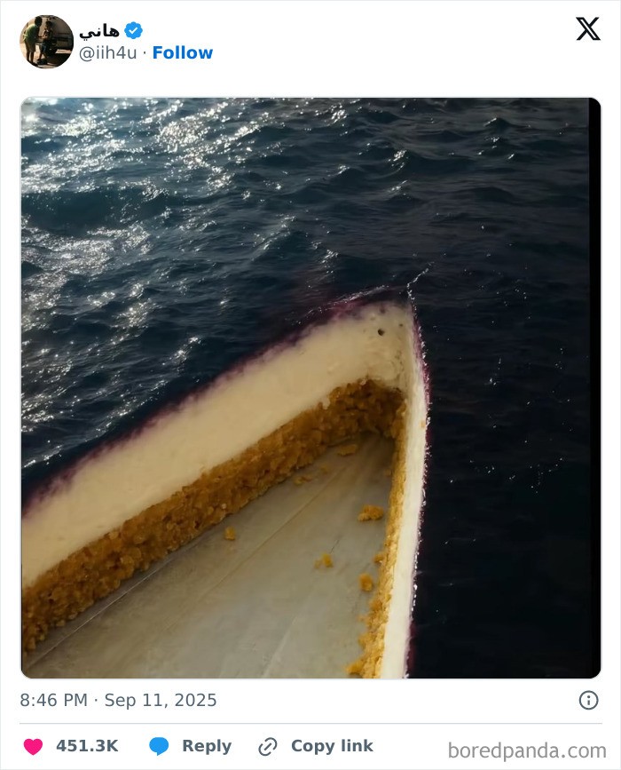 Kue Tart seperti perahu di lautan. Jika dilihat cepat, kue tart ini ini tampak sepertiΒ perahu di tengah lautan. Nyatanya, itu hanyalah potongan kue. Foto: Boredpanda