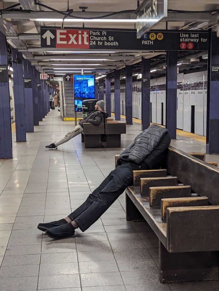 Pria Tanpa Kepala di Stasiun Sudut pandang bangku membuat jaket pria yang sedang rebahan tampak seperti tubuh tanpa kepala. Foto: Boredpanda