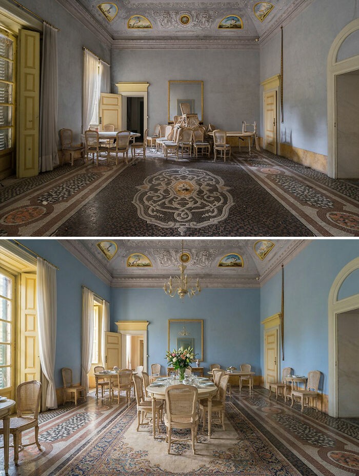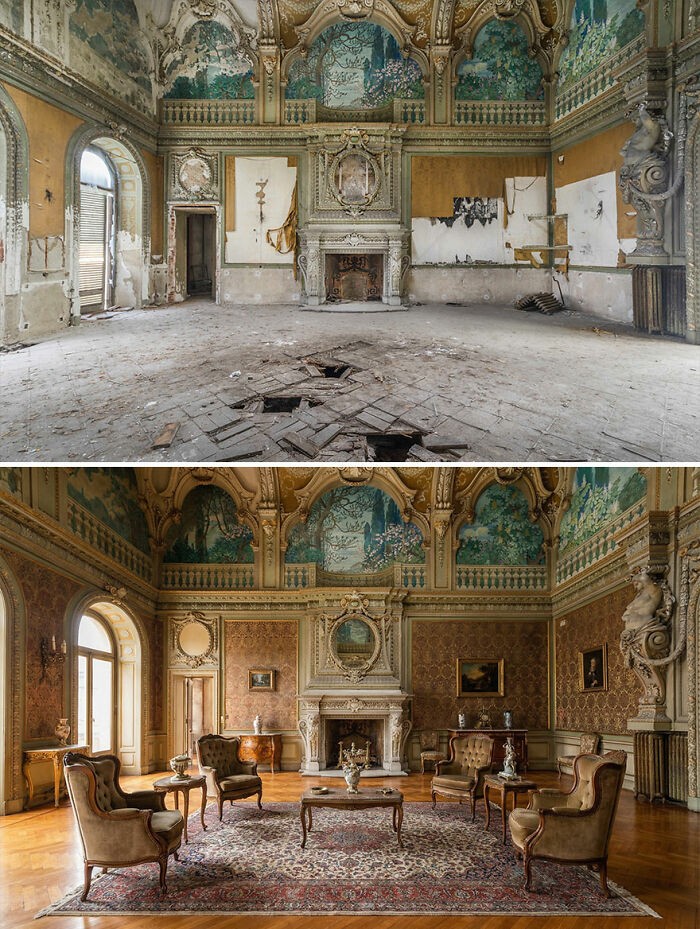 Ruang Balai Megah yang Terbengkalai. Before: Ruang balai penuh detail arsitektur klasik terlihat hancur, dinding mengelupas, lantai berlubang, dan ornamen rusak parah. After: Dengan bantuan AI, ruang ini direkonstruksi menjadi aula mewah dengan furnitur antik, karpet rumit, dan dekorasi dinding yang kembali hidup seperti era kejayaannya. Foto: Boredpanda