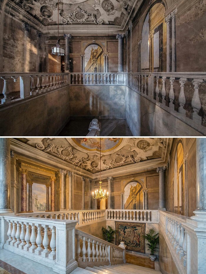 Tangga Istana yang Gelap dan Berdebu. Before: Area tangga megah tampak gelap, penuh debu, dan tidak terawat, dengan cat dinding pudar. After: AI menampilkan tampilan aslinyaβ€”tangga istana dengan marmer bersih, dinding bergambar fresko, dan lampu gantung mewah yang menerangi ruangan. Foto: Boredpanda