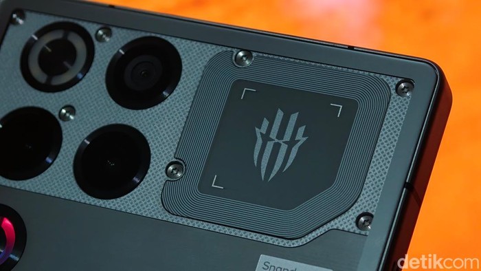 Panel belakang Redmagic 11 Pro menampilkan detail desain industrial dengan logo khas Redmagic, dipadukan material bertekstur yang menegaskan identitas ponsel gaming. Foto: Adi Fida Rahman/detikINET