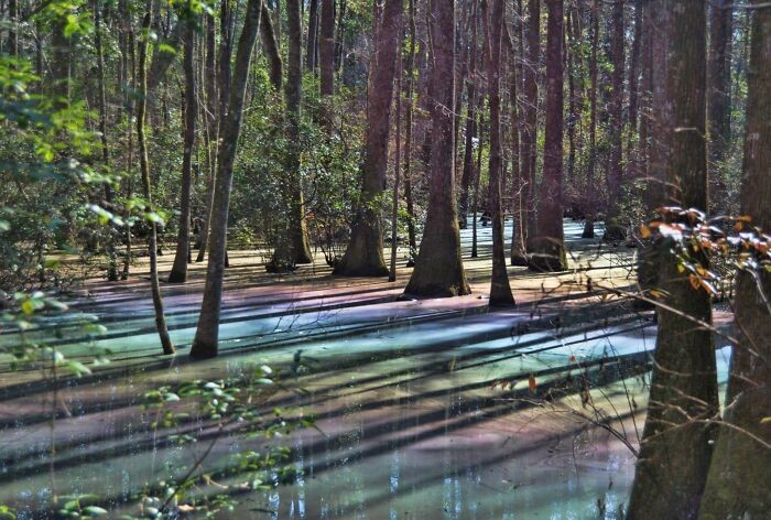 Daun-daun yang membusuk melepaskan asam tanin dan ketika Matahari menyinarinya, akan tampak efek pelangi yang indah di atas air. Foto: via Bored Panda
