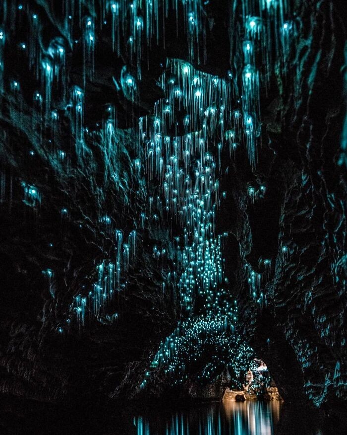Pemandangan luar biasaΒ glow worms, atau cacing pendar di Gua Waitomo, Selandia Baru.Β Foto: via Bored Panda