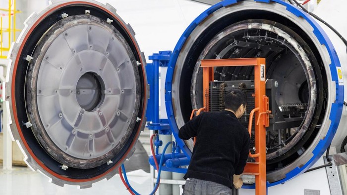 Seorang karyawan memasukkan komponen ke dalam ruang pemrosesan industri di aula perakitan pabrik LandSpace. Kepala perancang Zhuque-3, Dai Zheng, dalam sebuah wawancara dengan stasiun televisi CCTV setelah penerbangan perdana roket tersebut, mengatakan bahwa keputusannya pada tahun 2016 untuk bergabung dengan LandSpace dan meninggalkan Akademi Teknologi Kendaraan Peluncuran China, pengembang roket milik negara utama di negara itu, sebagian dimotivasi oleh visi yang berfokus pada penggunaan kembali dari perusahaan swasta seperti SpaceX. Foto: REUTERS/Maxim Shemetov