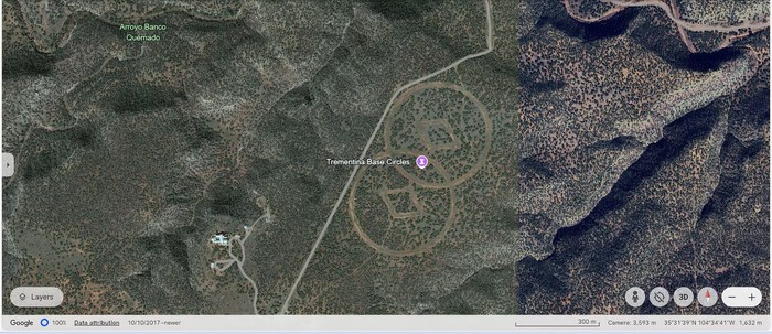 Koordinat 35Β°31β²28.56β³N 104Β°34β²20.20β³W. Salah satu lokasi paling menyeramkan di Google Earth adalah Gereja Scientology di New Mexico. Dua berlian besar di tengah sepasang lingkaran yang saling tumpang tindih terlihat terukir di dasar gurun dekat New Mexico. Beberapa orang mengira lokasi tersebut adalah bunker rahasia Gereja Scientology. Konon, fasilitas Gereja Scientology di Trementina, New Mexico, adalah katedral alien raksasa yang dapat diakses oleh para pengikutnya melalui penanda di tanah. Landasan udara pribadi juga terletak di dekatnya.Foto: The Travel