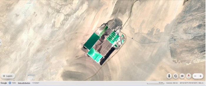 Koordinat 40Β°27'24"N 90Β°45'13"E. Di tengah gurun Asia, ditemukan sebuah struktur biru yang aneh. Berkat pengetahuan beberapa pengguna Reddit, telah dipastikan bahwa persegi panjang biru ini sebenarnya adalah kolam yang menguap yang ditemukan di Xinjiang, China. Daerah tersebut kaya akan kalium dan merupakan lokasi pertambangan utama. Kolam buatan ini menguap secara alami karena sinar matahari, dan berhasil diabadikan oleh Google Earth. . Foto: The Travel