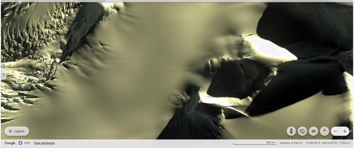 Jika Anda memasukkan "72Β°00'37"S 168Β°33'41"E" ke Google Earth, mereka mungkin akan terkejut dengan apa yang mereka temukan. Sekilas, tampak seolah-olah alien sedang mengintip kepalanya dari celah bulan. Namun sebenarnya, itu hanyalah desain alami yang sederhana di Antartika, gurun putih. Benua ini menyimpan beberapa "easter egg" yang dapat ditemukan di Google Earth, seperti wajah dan lainnya. Namun, yang tidak ditunjukkan oleh Google Earth adalah apa yang ada di bawah es di Antartika !Foto: The Travel