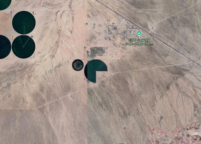 Koordinat 37 37'53.41"N, 115 45'22.34"W Di suatu gurun, terdapat ladang berbentuk lingkaran dan setengah lingkaran yang telah disiapkan dan dipangkas agar terlihat persis seperti karakter game arcade Pac-Man. Foto: The Travel