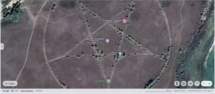 Koordinat 52Β°28'46"N 62Β°11'08"E. Bentuk pentagram telah lama dikaitkan dengan aktivitas okultisme dan hal-hal gaib . Ketika beberapa pengguna yang mencari Easter Egg di Google Earth menemukan ukiran mirip pentagram di Kazakhstan, mereka merasa khawatir.Foto: The Travel