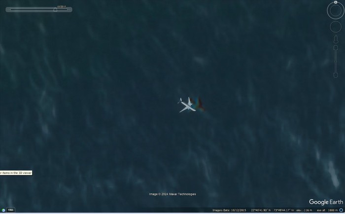 Koordinat 22Β°40'42"N 73Β°49'44"W. Sebuah video TikTok menjadi viral pada tahun 2022 di mana citra satelit dari aplikasi Google Earth menunjukkan sebuah pesawat yang tenggelam. Lokasinya dekat dengan Bandara Colonel Hill, tepat di lepas pantai Crooked Island di Bahama. Namun sebenarnya gambar pesawat dan bayangannya. Foto: The Travel