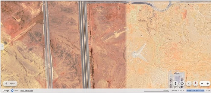 Koordinat 29Β°56'30.9"N 31Β°34'54.8"E. Satelit Google Earth sangat teliti sehingga dapat mengungkap misteri yang belum ditemukan oleh para arkeolog. Di sini, satelit menangkap struktur aneh di luar Kairo, Mesir. Struktur-struktur tersebut, yang tersembunyi tetapi terlihat dari atas, memiliki geometri aneh dengan sudut-sudut tajam dan apa yang tampak seperti "pintu masuk" yang mengarah ke bawah ke tanah. Beberapa orang berteori bahwa pintu masuk tersebut adalah pintu masuk militer rahasia, sementara yang lain berpikir itu adalah sistem kereta bawah tanah atau, yang lebih aneh, sesuatu dari alien.Foto: The Travel