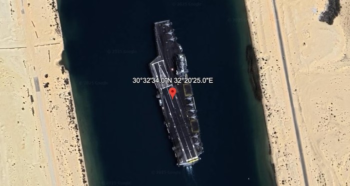 Koordinat 30Β°32'34"N 32Β°20'25"E: Sebuah Kapal Induk di Terusan Sue. Dari citra satelit, kapal itu tampak terang benderang saat berlayar melalui Terusan Suez, jalur maritim terpendek dari Eropa ke Asia. Para pengguna Reddit dengan cepat menduga bahwa itu adalah Charles de Gaulle, kapal induk Prancis, dan kapal utama Angkatan Laut Prancis, yang dinamai menurut nama presiden dan jenderal Prancis Charles de Gaulle. Foto: The Travel Foto: The Travel