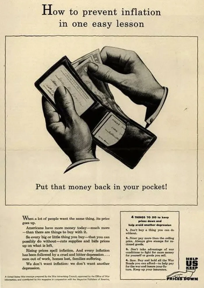 Rekomendasi cara mencegah inflasi saat Perang Dunia II berlangsung. Foto: Vintage Ads via Bored Panda