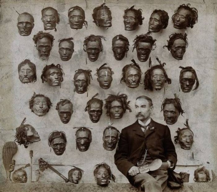Jauh sebelum penjajah Eropa tiba di Selandia Baru, penduduk asli Maori punya kebiasaan yang cukup mengerikan. Mereka melestarikan kepala terpenggal dari orang yang kalah. Tradisi ini disebut sebagai mokomokai, yang mana kepala dipotong, direbus, diasap, dikeringkan di bawah sinar matahari, dan dicelupkan ke dalam minyak ikan hiu sebelum dipajang atau diarak seperti piala. Sementara foto ini menampilkan Mayor Jenderal Horatio Gordon Robley yang berpose bersama koleksinya. Dirinya terpesona oleh suku Maori dan mencuri setidaknya 35 kepala untuk dirinya sendiri. Foto: Reddit