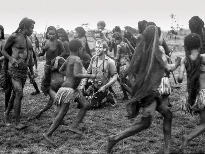 Foto ini memperlihatkan Michael Rockefeller (tengah), putra gubernur New York dan calon Wakil Presiden AS, Nelson Rockefeller. Michael menghilang di suatu tempat di Papua Nugini pada awal 1960-an. Perjalanan pertamanya ke wilayah tersebut pada Mei 1960. Diyakini dirinya dibunuh dan dimakan oleh sekelompok kanibal yang dikenal memenggal kepala musuh hingga memakan dagingnya. Foto: Reddit
