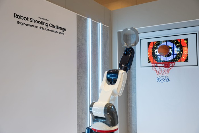 Samsung Display menguji ketahanan panel melalui Robot Shooting Challenge, simulasi tembakan berkecepatan tinggi untuk memastikan daya tahan layar dalam penggunaan ekstrem. Layar OLED digunakan sebagai target visual presisi dalam pengujian robotik, menegaskan akurasi dan ketahanan panel terhadap benturan berulang. Foto: Samsung Display