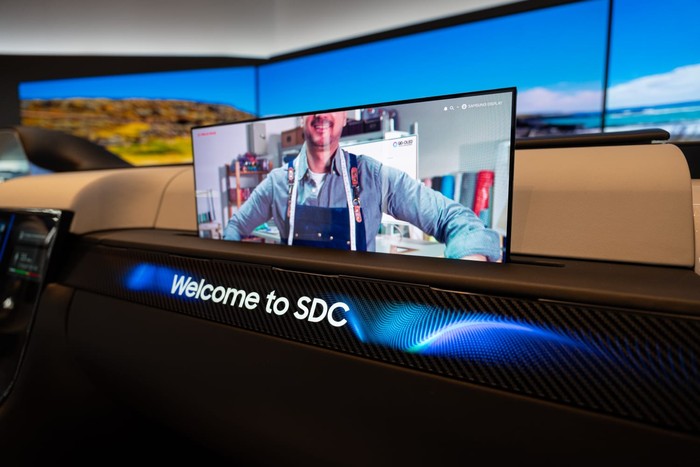 Panel OLED fleksibel Samsung Display memungkinkan dashboard kendaraan tampil lebih imersif, dengan layar menyatu dari tengah hingga sisi kabin. Foto: Samsung Display