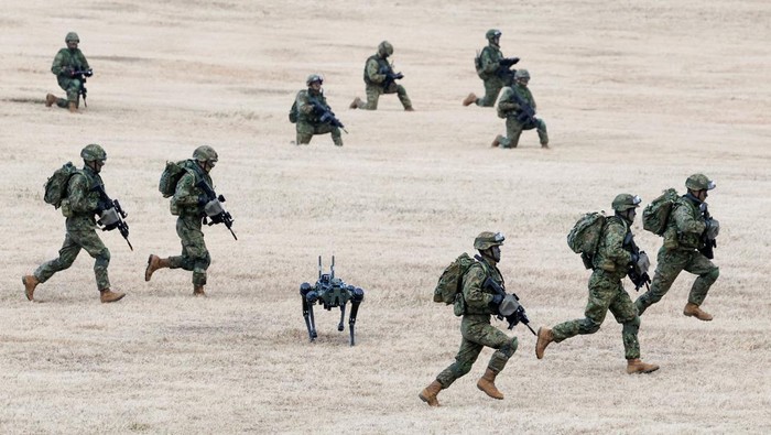 Salah satu yang menarik perhatian adalah keikutsertaan robot Vision 60 buatan Ghost Robotics dalam latihan tersebut. Robot berkaki empat itu terlihat bergerak bersama personel Brigade Lintas Udara ke-1 JGSDF, menjalankan simulasi operasi lapangan. REUTERS/Kim Kyung-Hoon