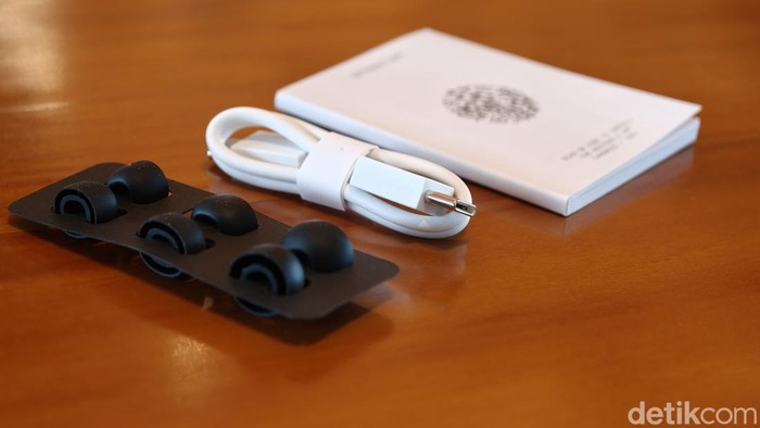 Aksesori yang diberikan dalam paket penjualan, termasuk pilihan ukuran eartips Foto: Adi Fida Rahman/detikINET