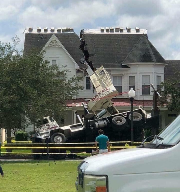Sebuah truk berat yang mengangkut kendaraan utilitas menabrak bagian bawah kanopi sebuah SPBU. Foto: Boredpanda