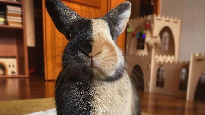 Pernahkah kamu melihat kelinci dengan warna yang terbagi sempurna? Kelinci ini terlihat seperti dua ekor kelinci yang dipotong setengah lalu disatukan kembali karena perbedaan warna hitam dan krem yang sangat kontras tepat di tengah wajah dan tubuhnya.Β Foto: Dok. Boredpanda
