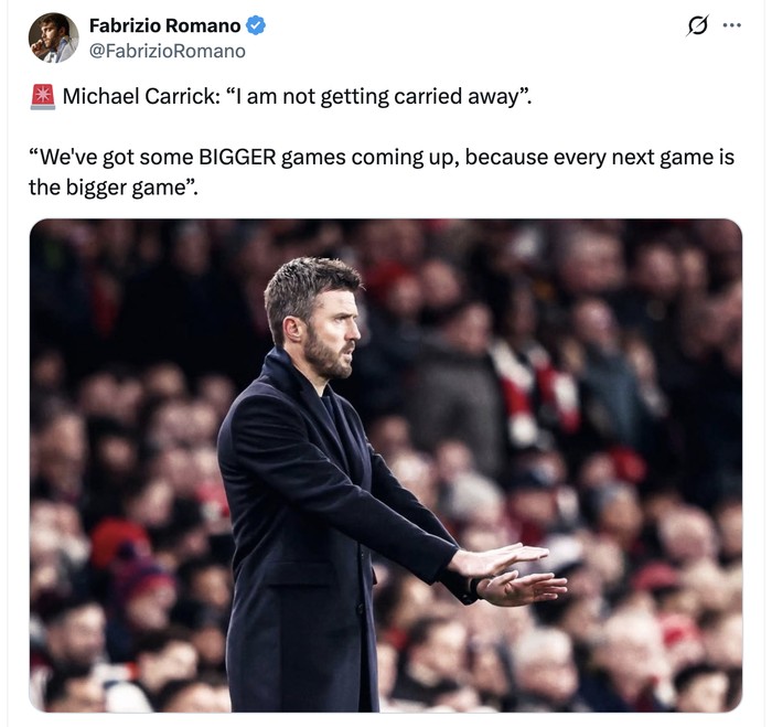 Fabrizio Romano melaporkan bahwa Carrick mengaku tidak akan terlena dan fokus menghadapi laga selanjutnya. Foto: X.com