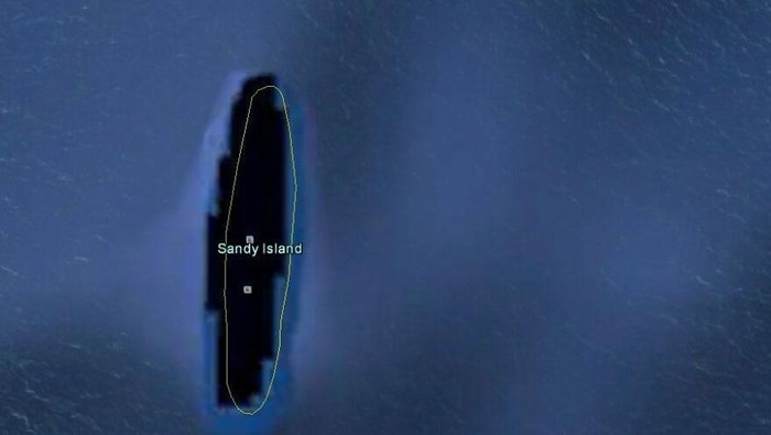Sebuah tempat misterius bernama Sandy Island muncul di Google Maps, di sebelah barat laut Kaledonia Baru. Namun ketika para ilmuwan berlayar ke sana pada November 2012, mereka hanye menemukan perairan, bukan daratan. Foto: (Bored Panda)