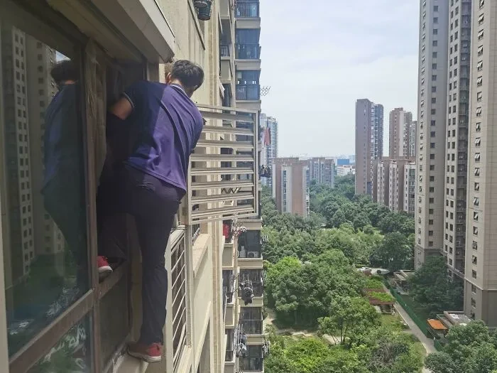 Membetulkan AC di lantai 13. Lokasi di Suzhou, China. Foto: jaapgrolleman via Bored Panda