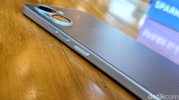 Bodi Tecno Spark Go 3 memiliki desain yang solid dengan ketebalan sekitar 8,10 mm. Ponsel ini telah dibekali rating IP64 untuk perlindungan terhadap air dan debu serta tahan banting hingga ketinggian 1,2 meter. Foto: Adi Fida Rahman/detikINET