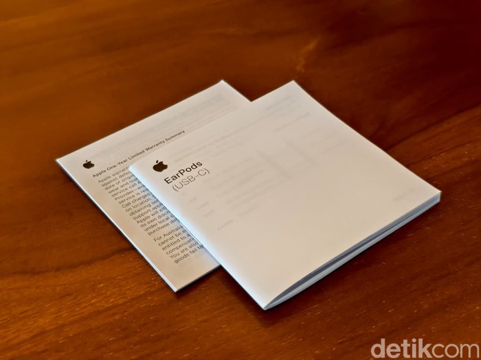 Buku panduan dan kartu garansi Apple EarPods USB-C yang disertakan di dalam kotak penjualan. Foto: Adi Fida Rahman/detikINET